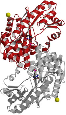 Fig. 3: The overall structure of the Mtb-DAP-AT homodimer. One monomer is represented in red, the other monomer in grey. The PLP moieties are represented as ball-and-stick models and the bound chloride ions as yellow spheres