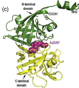 Fig. 6: Ribbon diagram of DAP epimerase from A. thaliana. The two domains (shown in green and yellow), and the substrate-mimic inhibitor AziDAP (spheres; magenta) is bound at the active site located in a cleft between the two domains[54].