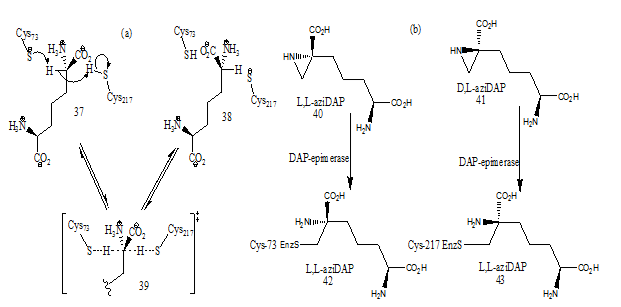 Fig. 5: (A) Epimerization reaction of L,L-diaminopimelic acid (DAP).(B) Inhibition of dap-epimerase by L,L-azi DAP and D,L-aziDAP.[51,52]