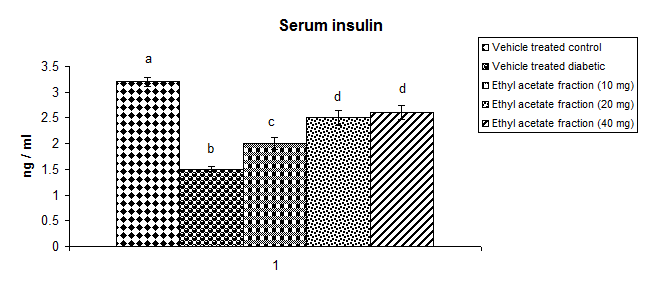Fig. 1: Significant recovery in the level of serum insulin after administration of ethyl acetate fraction of seed of M. fragrans at different dose treated groups in STZ-induced diabetic rat. Bars were expressed as mean±SEM (n=6). Bars with different superscripts (a, b, c, d) differ from each other significantly, p<0.05