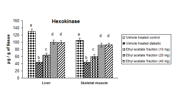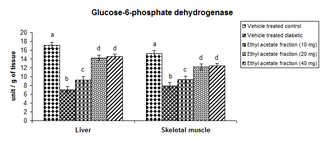 Activities of hexokinase and glucose-6-phosphate dehydrogenase in liver and skeletal muscle tissues were diminished significantly (p<0.05) in STZ-induced diabetic group in compare with the vehicle treated control group. After the treatment of ethyl acetate fraction of seed of M. fragrans at the dose of 10 mg or 20 mg or 40 mg/100 g of body weight for 28 d to the STZ-induced diabetic animals resulted a significant elevation (p<0.05) in the activities of these enzymes in respect to vehicle treated diabetic group. Results focused that 20 mg or 40 mg dose significantly effective (p<0.05) in compare with 10 mg dose of ethyl acetate fraction though the levels of the said sensors were not resettled to the control level. There was no significant variation in the levels of these parameters between 20 mg and 40 mg/100 g of body weight fraction treated diabetic groups (fig. 2).