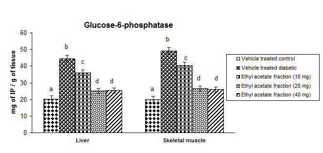 Activities of glucose-6-phosphatase in hepatic and skeletal muscular tissues were increased significantly (p<0.05) in the diabetic animals in compare with the vehicle treated control animals. Vehicle treated diabetic animals treated with different dose of ethyl acetate fraction of seed of M. fragrans resulted a significant diminution (p<0.05) in the activities of glucose-6-phosphatase in respect to the vehicle treated diabetic group. Comparative analysis of the data in the activities of the enzyme indicated that 20 mg and 40 mg/100 g of body weight dose treated group showed significant effective result (p<0.05) in compare with 10 mg/100 g of body weight dose treated group. There was no significant variation in the levels of these parameters between 20 mg and 40 mg /100 g of body weight fraction treated diabetic groups (fig. 2).