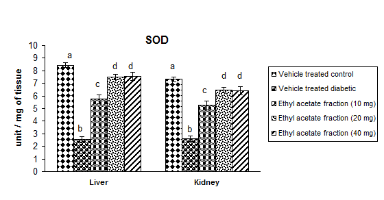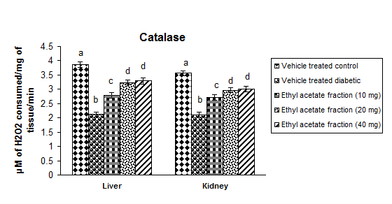 Fig. 3: Amelioration in the activities of catalase and SOD in hepatic and renal tissue after treatment with ethyl acetate fraction of hydro-methanol extract of seed of M. fragrans at different doses in STZ-induced diabetic rat. Values were expressed as Mean ± SEM, n=6. Bars with different superscripts (a, b, c, d) differ from each other significantly, p < 0.05