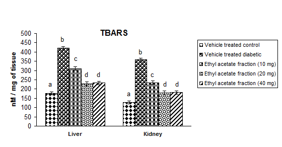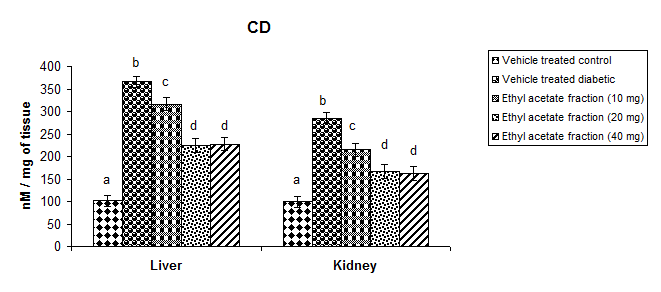 Fig. 4: Remedial effect of ethyl acetate fraction of seed of M. fragrans at different doses on TBARS and CD levels in hepatic and renal tissues in comparison to the vehicle treated diabetic rat. Values were represented mean±SEM (n=6). Bars with different superscripts (a, b, c, d) differ from each other significantly, p<0.05
