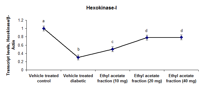 Fig. 5.1: Line diagram of qRT-PCR analysis of gene expression of hexokinase-I in hepatic tissue after administration of ethyl acetate fraction of aqueous-methanol (40:60) extract of seed of M. fragrans in diabetic animals. Values were expressed as mean±SEM (n=6). Values with different superscripts (a, b, c, d) differ from each other significantly, p<0.05