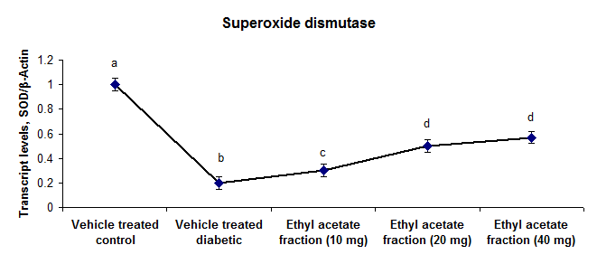 Fig. 5.2: Gene expression pattern of SOD in hepatic tissue after oral administration of ethyl acetate fraction of aqueous-methanol (40:60) extract of seed of M. fragrans to vehicle treated diabetic rat. Values were expressed as mean±SEM, n=6. Values with different superscripts (a, b, c, d) differ from each other significantly, p<0.05