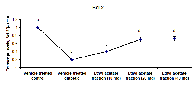 Results: After different doses of fraction treatment to the diabetic animals; FBG, serum insulin levels and activities of carbohydrate metabolic enzymes i.e. hexokinase, glucose-6-phosphate dehydrogenase and glucose-6-phosphatase were rectified towards the control at the level of p<0.05. There is a significant (p<0.05) recovery in the activities of antioxidant enzymes such as catalase and SOD in respect to the vehicle treated diabetic group. Oxidative stress end products such as CD and TBARS levels were increased significantly (p<0.05) in vehicle treated diabetic rats and was rectified significantly (p<0.05) after fraction treatment at the dose of 10 mg or 20 mg or 40 mg fraction treated group. Gene expression of hexokinase-1, superoxide dismutase, bax and bcl-2 was rectified towards vehicle treated control significantly at the level of p<0.05 after treatment of different doses of fractions to the diabetic animals.