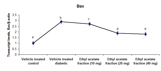 Fig. 5.3: Investigation of Bax, Bcl-2 gene expression through qRT-PCR in hepatic tissue after treatment with ethyl acetate fraction of aqueous-methanol (40:60) extract of seed of M. fragrans to vehicle treated diabetic rat. Values were expressed as mean±SEM, n=6. Values with different superscripts (a, b, c, d) differ from each other significantly, p<0.05
