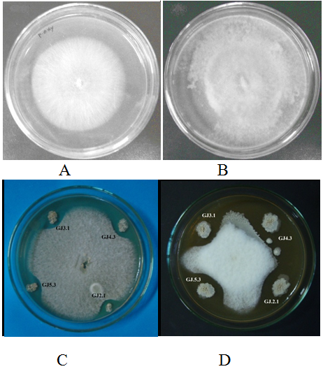 Fig. 2: In vitro inhibition activity of selected endophytic bacteria isolate against test fungi (A) Control plate of Fusarium oxysporum KFCC 11363P, (B) Control plate of Trichoderma reesei NBRC 31329 (C) Fusarium oxysporum, (D) Trichoderma reesei