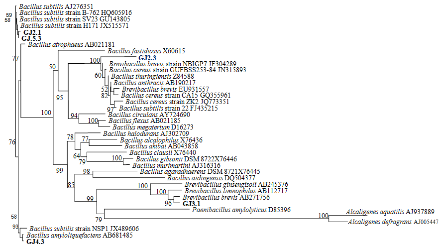 Nevertheless, it is necessary to evaluate determination of related species with other species based on database analysis of ribosomal genes. Analysis of 16S rRNA gene sequences of the isolates was used to perform phylogenetic construction by compare of the 16S rRNA gene sequences, all isolates are members of belong to the type species of Bacillus (GJ2.1, GJ5.3, GJ4.3) or Brevibacillus (GJ2.3 and GJ3.1) as shown in fig. 3.