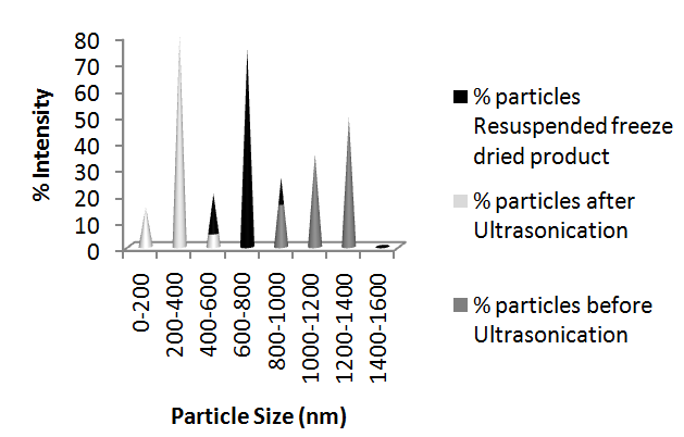 The IbNS were prepared and characterized using Cilas particle sizer and shape analyzer. The particle size of the suspension immediately after preparation and after freeze drying (resuspensed in water) was observed using the wet samples. A small amount of the samples were put in the particle sizer and observed. The shape analyzer (Figure 1) showed the spherical nature of the dispersion. This spherical shape was observed for only the re suspended freeze dried IbNS. For the sample shape analyzed immediately after the preparation of the IbNS, we were not able to observe the shape as the sensitivity of the shape analyzer is above 500 nm. The particle size showed distinct size differences between the nanodispersions analyzed before and immediately (after the preparation) after the ultrasonication, and the freeze dried product (Figure 2). Before ultrasonication, the particle size was found to be between 900-1400 nm. After ultrasonication, the particle size was found to be in the range of 150-300 nm with the maximum falling in this range (80%). The particle size of the freeze dried products was around 600-750 nm. The increase in the sizes of the freeze dried product can be attributed to agglomeration during the process as compared to the suspension analyzed immediately after the ultrasonification.