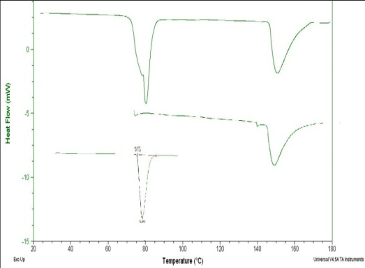 DSC is thermal analysis, which determines the physical properties of a sample, and measures the heat quantity absorbed by the sample on the basis of temperature difference between the sample and the reference. The DSC profiles of pure and physical mixtures of Ibuprofen were recorded on Q20 DSC (TA Instruments, USA). Thermal behaviors were studied under normal conditions with hermetic Aluminum pans and with a nitrogen gas flow of 50 mL/min. The samples (5.7 mg for pure Ibuprofen, 5.9 mg for HPMC, and 8.4 mg for Ibuprofen: HPMC (1:1), were heated at 10oC/min over a temperature range of 20-100oC, 0-250oC, and 20-180oC, respectively. The reference sample used in all 3 determinations was empty Hermetic Aluminum pans. Peak temperatures were noted and reported.