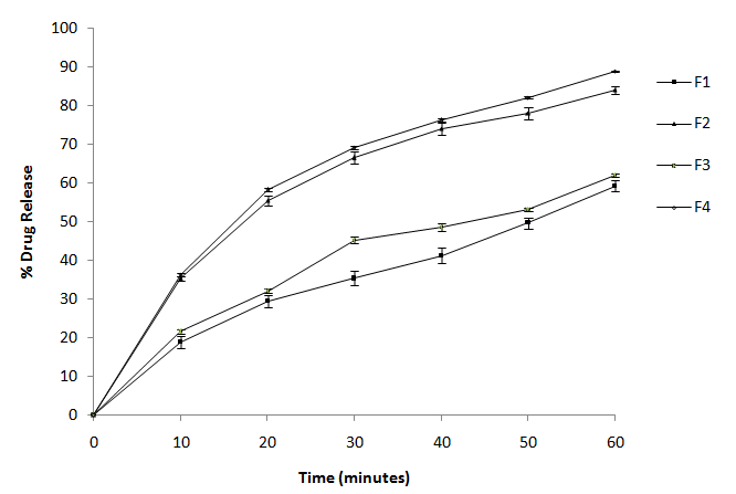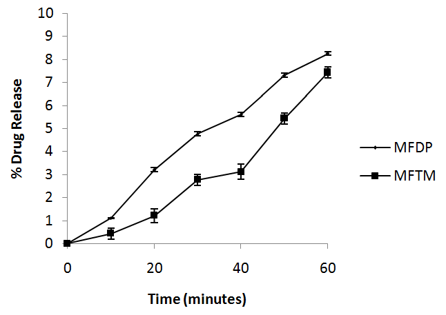 The drug content for the prepared nanoformulation was found to be 98.21 ± 1.52%. The drug release study (Figure 7)suggested that the nano-formulations had a completely different release profile with the dissimilar factor (f2) being 25 and statistically significant (p=1.0232 ± 0.4325) compared to the pure form of the drug. The probable reason was the increase in the surface area of the nano formulation coupled with a hydrophilic carrier which enabled better solubility thereby better dissolution.