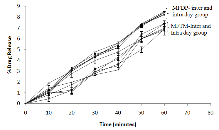 The intra-day and inter-day precision studies were also conducted on the samples. Brand A samples were utilized [36]. Which were analyzed by the two techniques in the morning and afternoon for intra-day precision studies for a consecutive three days (inter-day precision studies). Three different researchers for each set of techniques were assigned to collect the samples to study the easy of handling the dip probe as compared to the traditional method and the error involved. The samples were coded MFDP (marketed formulation utilizing dip probe for analysis) and MFTM (marketed formulation utilizing traditional methods for analysis).
