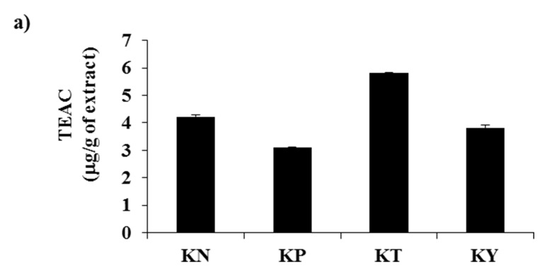 Fig. 1: TEAC value (a), DPPH inhibition (b), and lipid peroxidation inhibition (C) of essential oil from Kao-Namphung (KN), Kao-Puang (KP), Kao-Tang-Gwa (KT), and Kao-Yai (KY).