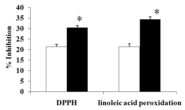 Fig. 8: Inhibitory activities against DPPH and lipid peroxidation of 15% KT oil () and ME () (* denotes p< 0.01).