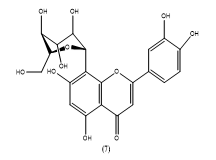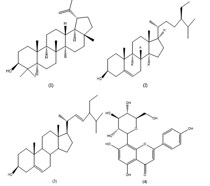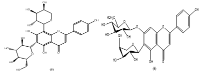 Clinacanthus nutans contains lupeol (1), b–sitosterol (2)[17], stigmasterol(3) [16] Botulin[18] and myricyl alcohol [10][11]. It also contain six known C-glycosyl flavones isolated from the n-BuOH- and water soluble portion of the methanolic extract of the stems and leaves of C. nutans collected in Thailand such as vitexin (4), isovitexin, shaftoside (5), isomollupentin 7-O-b –glucopyranoside (6), orientin (7) and isoorientin[12].