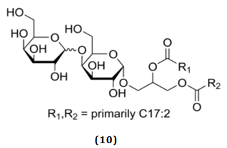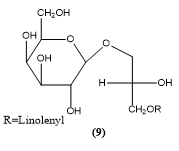 Five sulfur-containing glucosides were isolated from the n-BuOH-soluble portion of a methanolic extract of the stems and leaves of plant material [13]. A mixture of cerebrosides (8) and a monoacyl monogalactosyl glycerol[(2S)-1-O-linolenoyl- 3-O-b-D- galactopyranosylglycerol](9) were isolated from the EtOAc-soluble fraction of the ethanolic extract of the fresh leaves of C. nutans [14].