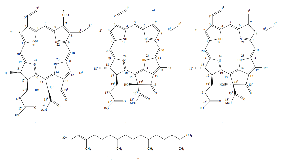 Three chlorophyll derivatives (phaeophytins) (11-13) were isolated from the chloroform extract of Clinacanthus nutans Lindau leaves. Three of these were known compounds with structures related to chlorophyll a and chlorophyll b namely 132-hydroxy- (132-R)- phaeophytin b, 132-hydroxy- (132-S)- phaeophytin-a and 132-hydroxy-(132-R) -phaeophytin [21].