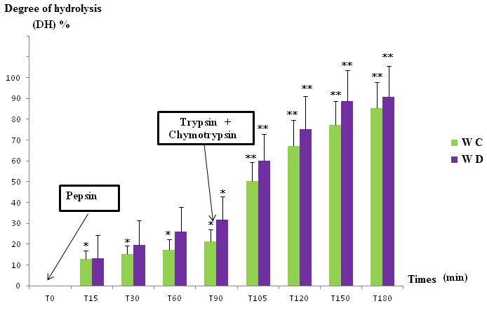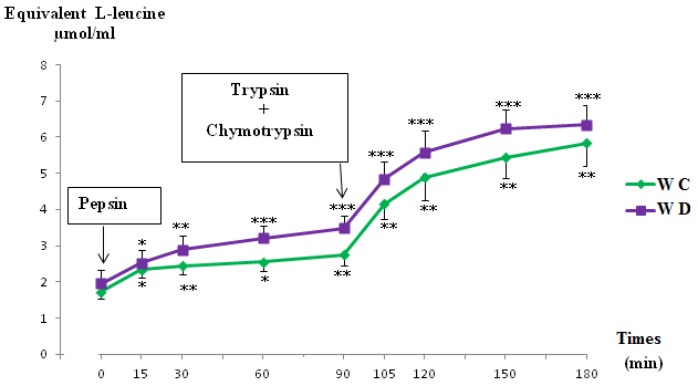 Fig. 1: Kinetics of combined hydrolysis of the wheys by pepsin (E/S R 1:25) and trypsin-chymotrypsin (E/S R 1:100), in each case for 90 min. Values are means ± SE for five determinations (* p<0. 05, ** p<0. 01 and *** p<0. 001).W C = whey of cow’s milk and W D = whey of dromedary’s milk