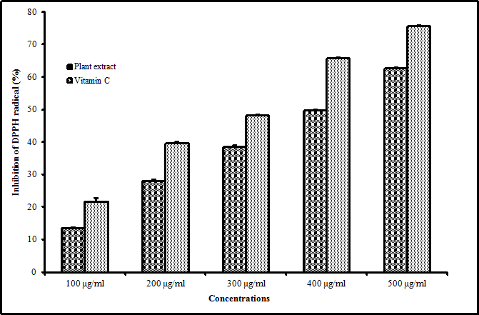 Fig. 1: Determination of DPPH radical scavenging activity (%) of ethanolic extract of M. concanensis nimmo leaves and vitamin C. All experiments were done in triplicate, results are represented as mean±Std (P<0.05)