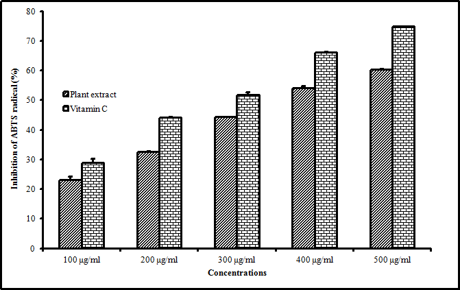 Fig. 2 depicts the antioxidant activity of ethanolic extract of M. concanensis Nimmo leaves against ABTS radical scavenging. The ABTS radical scavenging activity of the extract was varied significantly (P<0.05) and ranged from 23.05% at 100 µg/ml of 60.26% 500 µg/ml concentrations. However, the IC50 value of M. concanensis Nimmo leaves was found to be 353.14 µg/ml, and known antioxidant compound of vitamin C was 280.25 µg/ml. The highest percentage of scavenging property was noted in our study, and our results suggested the high amount of antioxidant potential of M. concanensis Nimmo leaves.