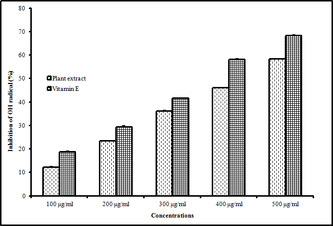 Hydroxyl (OH) radical scavenging activity of the plant extract was calculated by the method of Rajeshwar et al. [17] with slight modifications. A reaction mixture of 3.0 ml volume contained, 1.0 ml of 1.5 mmol FeSO4, 0.7 ml of 6 mmol hydrogen peroxide, 0.3 ml of 20 mmol sodium salicylate and 1.0 ml of different concentrations (100-500 mg/ml) of leaf extract was mixed well and incubated for 1 h at 37 °C. The absorbance of the hydroxylated salicylate complex was measured at 562 nm. Vitamin E was used as positive control. The percentage of scavenging potential was calculated as,