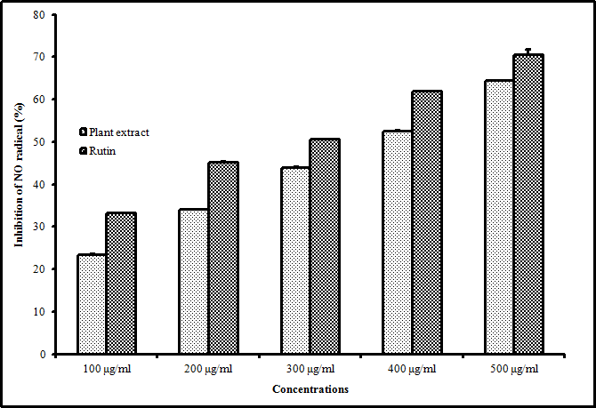 Fig. 4: Determination of nitric oxide radical scavenging activity (%) of ethanolic extract of M. concanensis nimmo leaves and rutin. All experiments were made in triplicate, results are represented as mean±standard deviation (P<0.05)