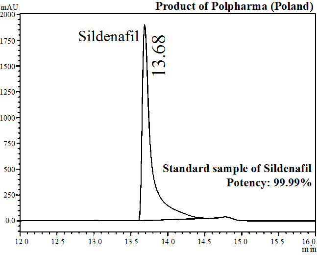 The stock solution of standard sildenafil citrate was prepared by dissolving 1.5 mg/ml in methanol based on the solubility of the synthetic drug and stored in a refrigerator and brought to room temperature prior to use. The working solution was prepared by making a serial dilution of the stock solution with methanol to about 0.0467 mg/ml. The injection volume was 20 μl for each working solution and the procedures were done for triplicate.
