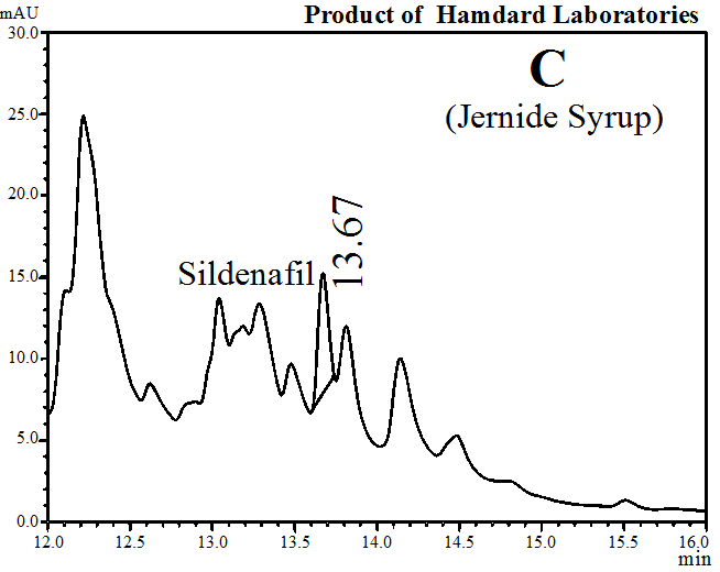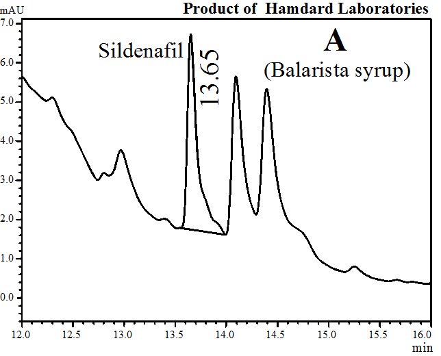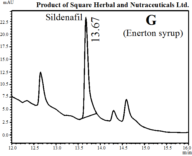 Results: All the products (A–I) were found to contain sildenafil citrate as an adulterant. HPLC peak of the adulterant was confirmed by comparing retention time, UV spectra generated by PDA detector and peak spiking with the authentic sample of sildenafil citrate. The quantity of sildenafil citrate in A, B, C, D, E, F, G, H and I syrups were found to be 17, 22, 26, 25, 10, 24, 29, 22 and 17 mg/100 ml, respectively.