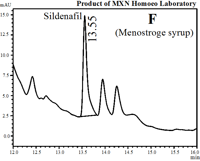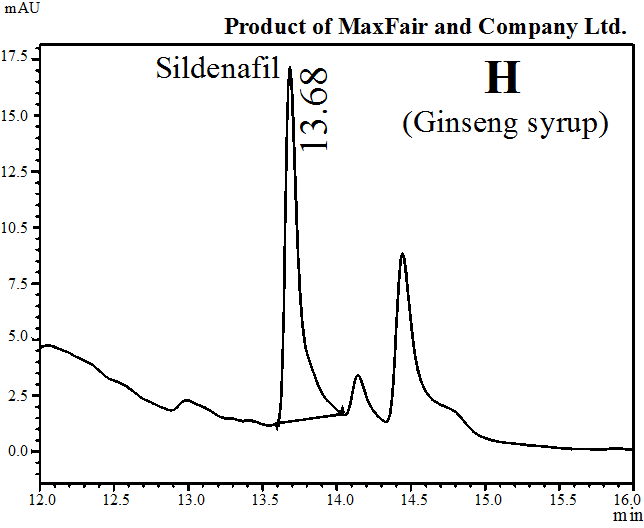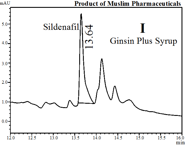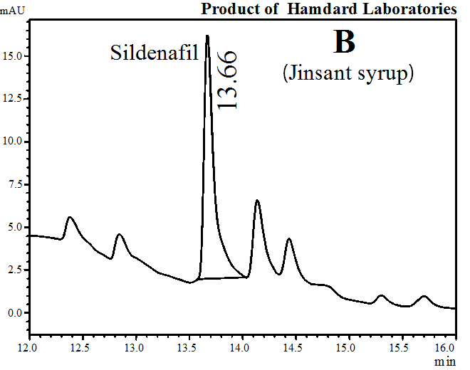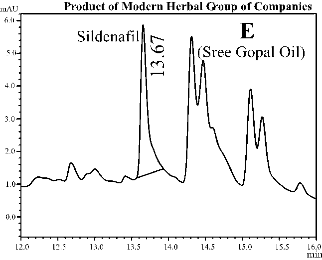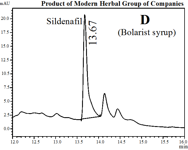 Table 3 showed the quantity of sildenafil citrate as an adulterant in herbal products. The results indicated that the herbal products Balarista (A), Jinsant (B) and Jernide (C) of Hamdard Laboratory contained 17, 22 and 26 mg, respectively, Bolarist (D) and Sree Gopal Oil (E) of Modern Herbal contained 25 and 10 mg, respectively; Enerton (G) of Square Herbals contained 29 mg, Mengstroge (F) of MXN Homoeo contained 24 mg, Ginseng (H) of MaxFair contained 22 mg, and Ginsin Plus (I) of Muslim Pharmaceuticals contained 17 mg of sildenafil citrate in 100 ml syrup.