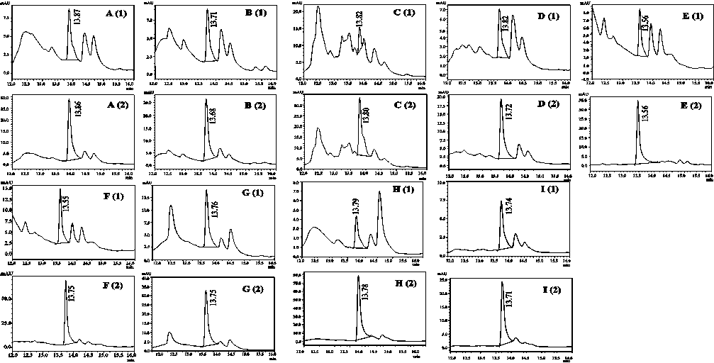 Fig. 2: HPLC chromatograms of (1) herbal products (A-I), and (2) sildenafil citrate spiked in the herbal products (A-I)