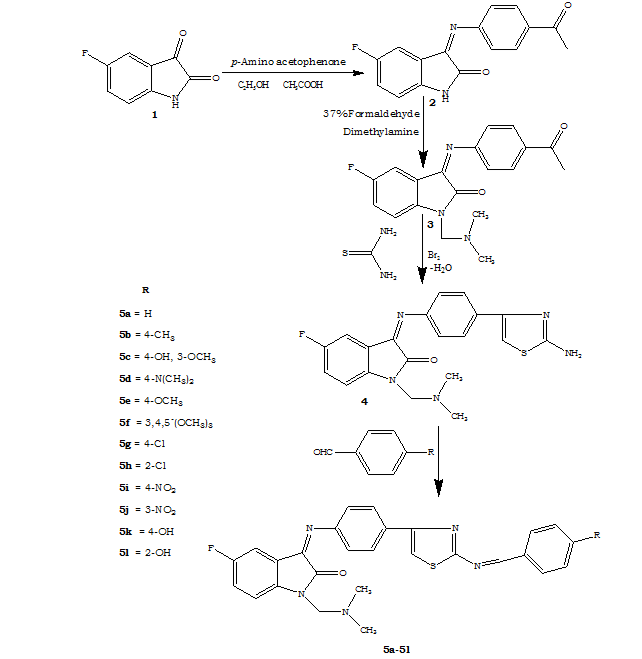 In this study, we synthesized a series of novel Schiff and mannich bases of isatin derivative by substituting different aromatic aldehydes at the 3rd position through thiazole ring. And dimethylamino group at the N-1 position with formalin. Initially, 5-fluoro isatin and p-amino acetophenone were used as starting materials to produce 3-(4-acetylphenylimino)-5-fluoroindolin-2-one by a condensation reaction, which proceeds selectively on the carbonyl group in position 3 of the isatin ring. Furthermore, this compound was treated with dimethylamine and formalin gave 3-(4-acetylphenylimino)-1-((dimethylamino)methyl)-5-fluoroindolin-2-one. In this way the formed mannich base is reacted with thiourea in presence of bromine to offered a cyclic thiazole compound namely 3-(4-(2-aminothiazol-4-yl) phenylimino)-1- ((dimethyl amino) methyl)-5-fluoroindolin-2-one. Finally this compound was treated with different aromatic aldehydes in the presence of glacial acetic acid, and a variety of Schiff base derivatives have been isolated according to the synthetic Scheme 1. IR, 1H-NMR, mass spectra, and elemental analyses of the synthesized compounds are in accordance with the assigned structures. The IR spectra of all synthesized compounds showed some characteristic peaks indicating the presence of particular groups. The absorption bands at, around 1725 cm-1, and weak band around 1650 cm-1, which can be assignable to C=O, and C=N (azomethine linkage) vibrations respectively.
