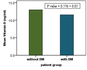 Fig. 1: The mean plasma 25(OH)D concentrations in acute coronary syndrome patients; A: between smokers and nonsmokers; B: those with and without hypertension; and C: those with and without diabetes mellitus (DM)