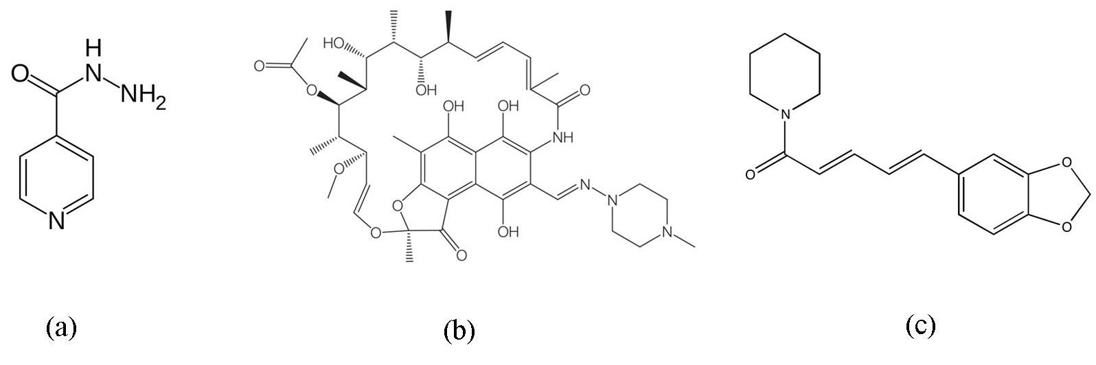 Fig. 1: Chemical structure of (a) INH (b) RIFA and (c) PIPE