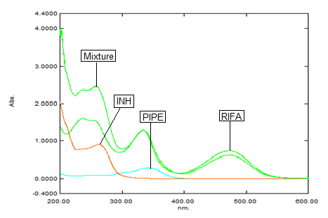 The proposed method is based on spectrophotometric absorption correction method for the simultaneous estimation of INH, RIFA and PIPE in UV and Visible region using methanol and distilled water as solvents. The overlain spectra of INH, RIFA, PIPE and mixture are shown in Fig. 2.