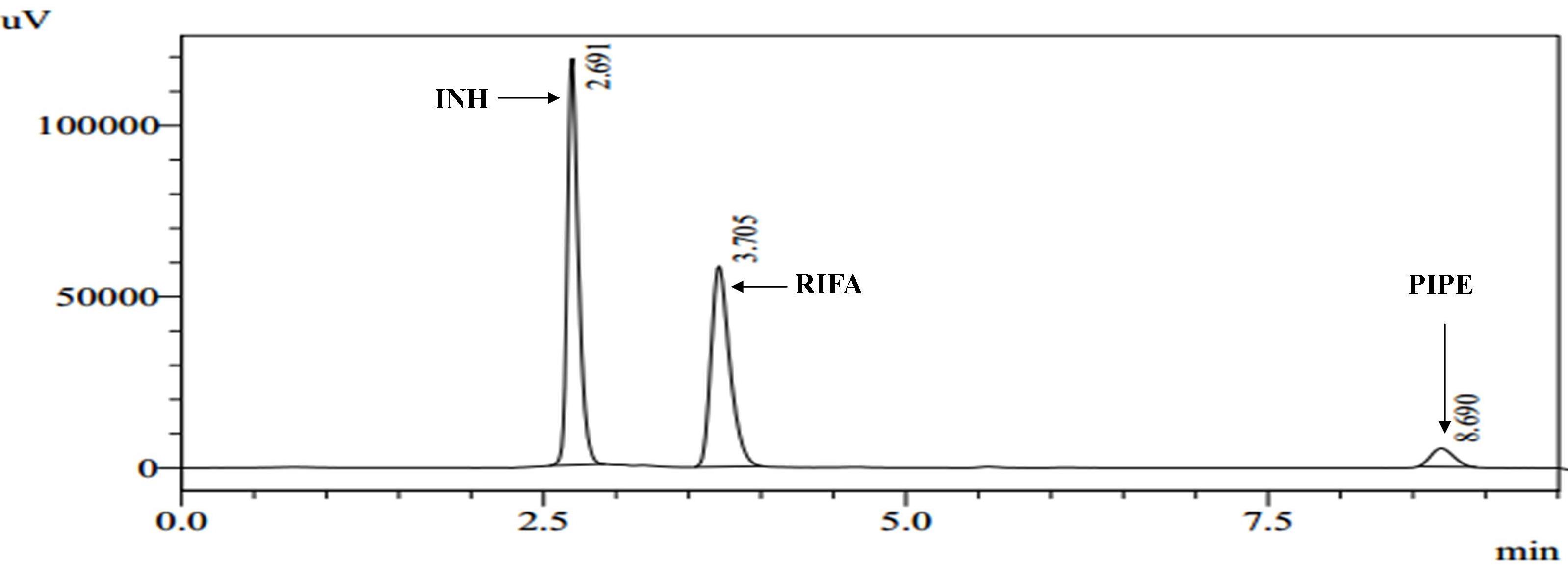Twenty capsules were accurately weighed and finely powdered. Capsule powder weight equivalent to 300 mg of INH, 200 mg of RIFA and 10 mg of PIPE accurately weighed and transferred to a into 100 mL amber colored volumetric flask and 70 mL of methanol was added. The mixture was sonicated for 20 min and diluted up to the mark with methanol and filtered through a whatman filter paper no.41. From this solution 1 mL aliquot was withdrawn into a 10 mL amber colored volumetric flask and diluted up to the mark with distilled water. Solution contains 300 µg/mL of INH, 200 µg/mL of RIFA and 10 µg/mL of PIPE. From this solution 0.85 mL aliquot was withdrawn into 10 mL amber colored volumetric flask and diluted up to mark with water. So the solution contains INH (25.5 μg/mL), RIFA (17 μg/mL) and PIPE (0.85 μg/mL). The analysis procedure was repeated six times for the capsule formulation.