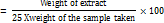 Five grams of dried powder of Guazuma ulmifolia fruit were taken in a conical flask, added 100 ml of ethyl acetate, plugged with cotton wool and then kept on a rotary shaker at 120 rpm for 24 h. Pipetted out 25 ml of filtrate in a pre-weighed 100 ml beaker and evaporated to dryness on the water bath, then it was kept in an air oven at 105 °C for 6 h and in desiccator for 30 min and weighed.