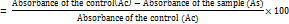 Free radical scavenging assay for ethanolic fruit extract of Guazuma ulmifolia was taken at various concentrations (100, 200, 300, 400 and 500 µl/ml) in small tubes and made up to 1 ml using methanol. 1 ml of 0.01 mmol DPPH dissolved in methanol was added to all the test concentrations and maintained in the dark for 30 min, at room temperature. The absorbance of the solutions was read at 517 nm. The percentage inhibition and the IC50 values were calculated with DPPH as the control and butylated hydroxyanisole (BHA) as the reference [18]. The concentration in µg of dry material per ml of solvent (µg/ml) that inhibits the formation of DPPH radicals by 50% is defined as IC50 value.