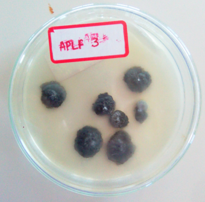The sequence of the ITS gene from sample APLF-3 and APLF-4 that of matching sequences from 10 nucleotide sequences were aligned by using the maximum likelihood method based on the Tamura-Nei model (fig. 7). The tree with the highest log likelihood (-999.5085) for APLF-3 and (-1106.5583) for APLF-4 is shown. There were a total of 572 positions in the final dataset for APLF-3 and 608 positions for APLF-4 respectively. Evolutionary analyses were conducted in MEGA5. The sequence of the ITS gene for APLF-3 and APLF-4 were compared with existing sequences in the NCBI database using the Blast N programme (fig. 8). Based on these results APLF-3 and APLF-4 were identified as Phyllosticta sp. ZLY-2010 isolate M13 and Aspergillus tubingensis strain Cs/7/2 respectively. The microscopic view of the identified organisms is shown in fig. 9 and 10.