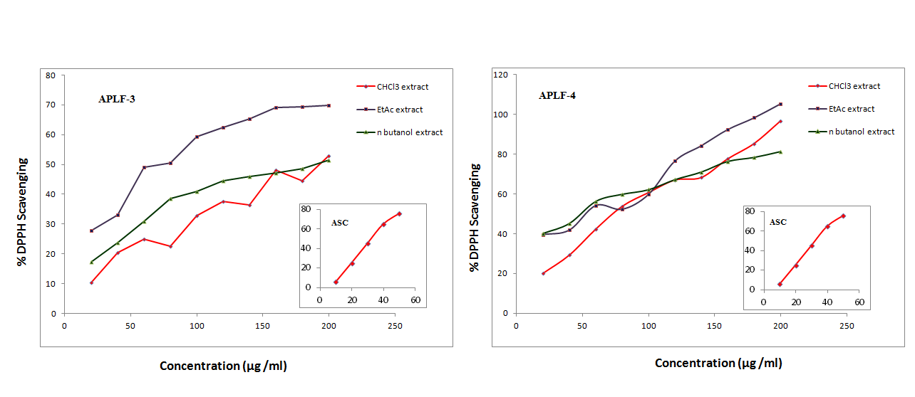 DPPH free radical scavenging activity was carried out for all the extracts of APLF-3 and APLF-4 at different concentrations [25].