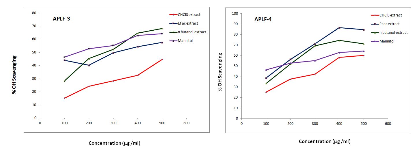 Hydroxyl radicals were generated by a Fenton reaction (Fe3+-ascorbate-EDTA-H2O2 system), by using the extracts of APLF-3 and APLF-4, the scavenging capacity for the hydroxyl radicals was measured using deoxyribose method [26].
