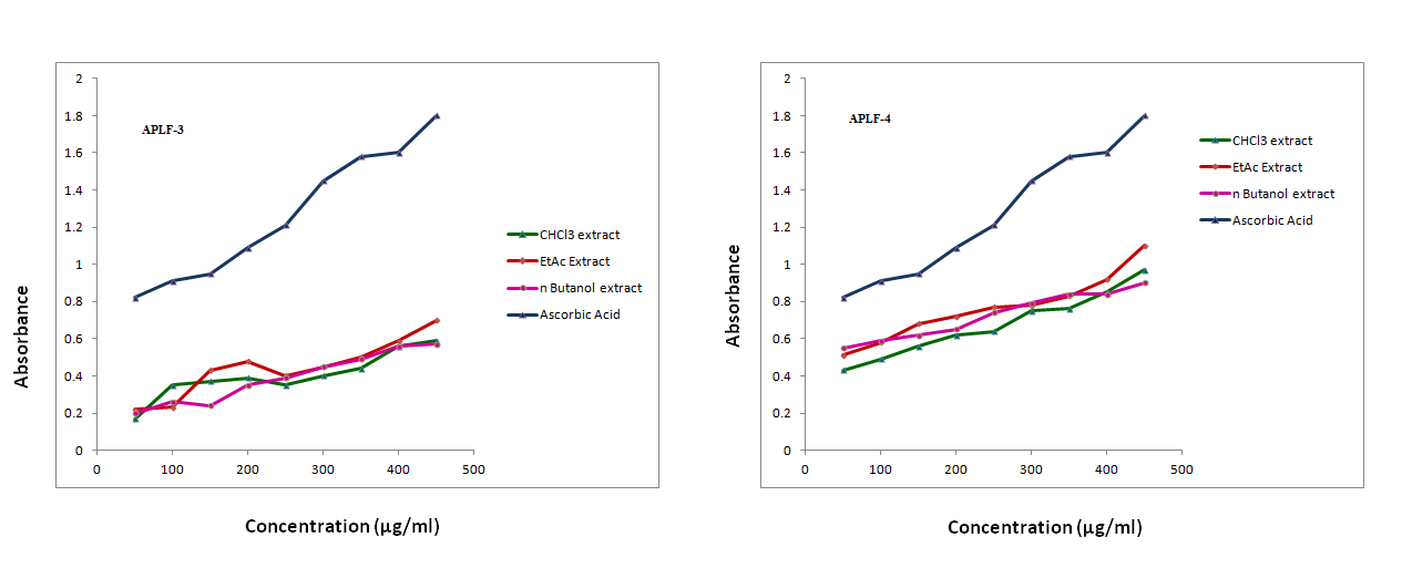 In this assay, Fe (III) reduction is often used as a significant indicator of electron donating activity which is an important mechanism of phenolic antioxidant action by breaking the radical chain by donating a hydrogen atom. Reducing the power of extracts of APLF-3 and APLF-4 (50-450µg/ml) increased with increase in concentration. The A4EA and A4nB showed more effective reductive ability when compared to other extracts. The A4EA and A4nB showed the highest activity in a dose-dependent manner as compared to the other extracts (fig. 5).
