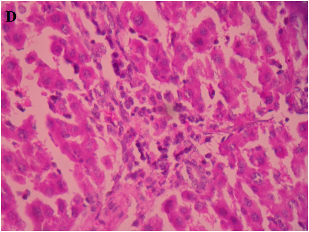 Normal hepatic cell arrangement was observed in the normal liver. Central vein, portal tract, and normal kupffer cells showed no inflammation (fig. 6A). In CCl4 treated group hepatocytes exhibited large degeneration of fatty cells, congestion of central vein and sinusoid, spotty necrosis, focal hemorrhage, ballooning and inflammation of hepatic cells (fig. 6B). In standard silymarin (100 mg/kg) treated group the hepatic globular structure was found to be normal. Mild central vein and sinusoidal congestion were noticed. Regeneration of hepatocytes was also found (fig. 6C). A4EA treated livers (50 mg/kg) exhibited normal rearrangement of hepatocytes surrounding the necrosis and fatty vacuoles (fig. 6D). A4EA treated livers (100 mg/kg) showed mild congestion of central vein and sinusoid. Mild inflammation and focal hemorrhage were seen, whereas no degeneration and ballooning of hepatic cells was observed (fig. 6E). A4nB (50 mg/kg) treated livers showed decreased inflammation of hepatocytes. Mild ballooning and degeneration of injured liver were restored (fig. 6F). A4nB (100 mg/kg) treated livers also showed regeneration of hepatocytes with mild inflammation and ballooning (fig. 6G).