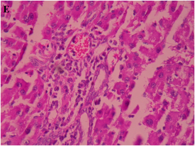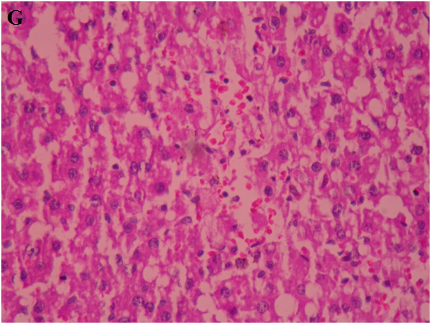 Fig. 6: Histopathological sections of liver with CCl4 induced hepatotoxicity: A. Normal liver, B. CCl4 induced rat liver, C. Silymarin treated rat liver, D. A4EA (50 mg/kg), E. A4EA(100 mg/kg), F. A4nB(50 mg/kg), G. A4nB (100 mg/kg)