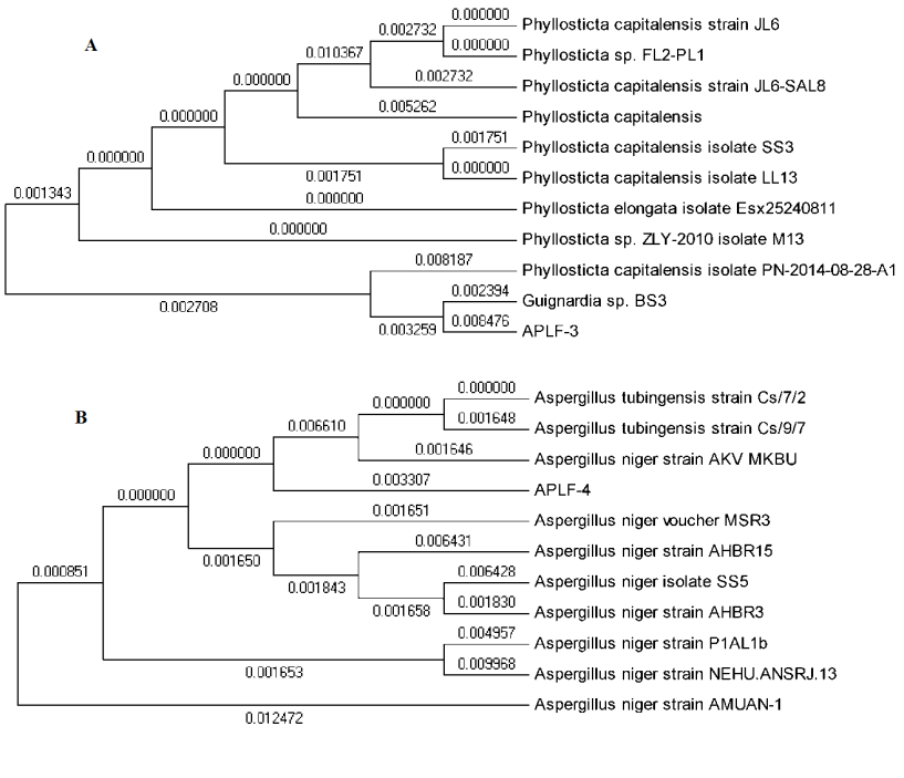 Fig. 8: Phylogenetic trees analysis of APLF-3 (A) and APLF-4 (B) were compared with existing sequences in the NCBI database using the BlastN program. The DNA sequence of APLF-3 matched with Phyllosticta sp. ZLY-2010 isolate M13 and APLF-4 matched with Aspergillus tubingensis strain Cs/7/2