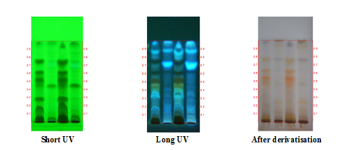 A4EA and A4nB (500 mg) extracts were dissolved in 1 ml of ethyl acetate and n-butanol respectively. 3 µl and 6 µl of the above extracts were applied on a pre-coated silica gel F254 on aluminum plates to a bandwidth of 7 mm using Linomat 5 TLC applicator. The plate was developed in Toluene and Ethyl acetate in ratio 1:1. The developed plates were visualized in short UV, long UV and then derivatized with vanillin-sulphuric acid and scanned under UV 254 nm, 366 nm, and 620 nm. Rf value of the spots and densitometric scan were recorded [23, 24].