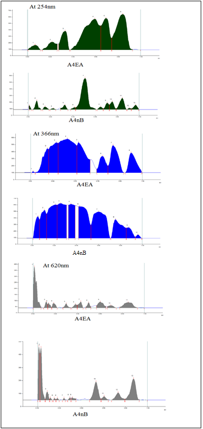 Fig. 12: Chromatograms of A4EA and A4nB extracts at 254 nm, 366 nm and 620 nm