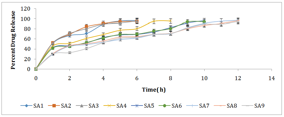 The dissolution profile of all the batches revealed that concentrations of sodium alginate, calcium carbonate and HPMC K100M have an important role in drug release pattern. In vitro drug release profile is depicted in (fig. 1). Among the 9 formulations evaluated, SA1 which contained the lowest proportion of sodium alginate and calcium carbonate showed burst release with > 90 % drug released in about 4 h though HPMC K100M was also present in the formulation. On the other hand formulations SA7, SA8 and SA9 which contained the highest proportion of sodium alginate, calcium carbonate with HPMC K100M displayed a gradual and sustained release over a period of 12 h.