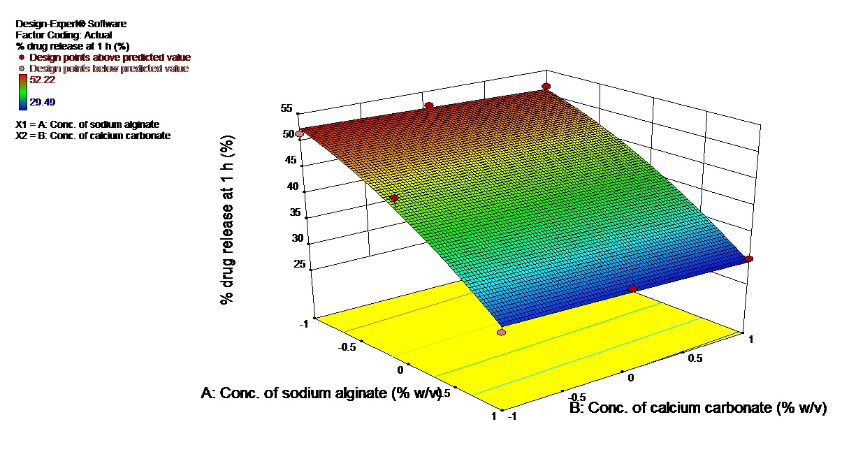 Fig. 2: 3-D Response surface plot showing the influence of sodium alginate and calcium carbonate concentration on the percent drug release at 1 h.